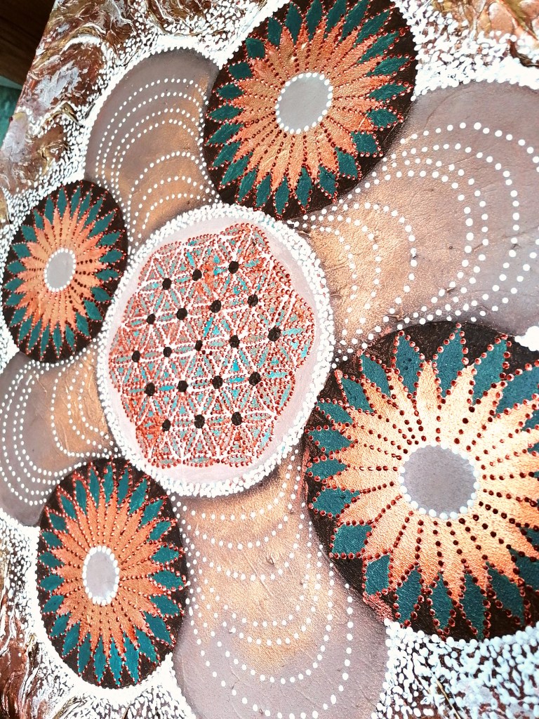 Kai formavau mandalą, intuityviai norėjosi 4 ašių. Sakralinėje geometrijoje 4 – tai stabilumas, tvarka, įsižeminimas, harmonija, pagrindas, saugumas. Taip atsirado 4 vienos rūšies apskritimai, ir 4 – kitos, per gyvybės gėlės simbolį centre, susijungę į stabilią visumą. O pati mandala, įsižiūrėjus į ją supantį reljefą, atrodo tarsi būtų išskaptuota iš varinio medžio…