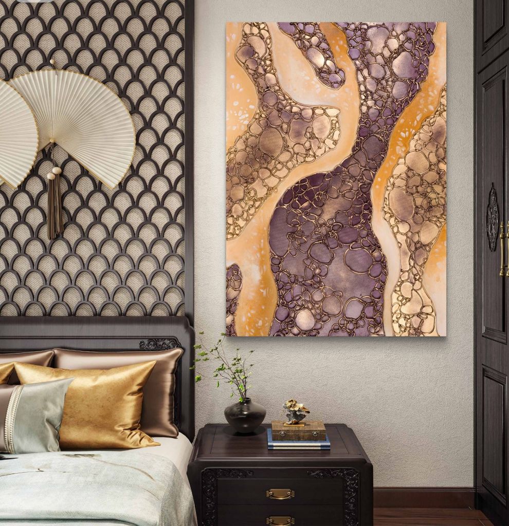 Na, o dėl savo daugybės metalizuotų aukso, vario, bronzos atspalvių, pagyvinusių violetinę-kakavinę spalvų gamą, atrodo dar ir labai prabangiai. Puikiai derės tiek tamsių, tiek ir šviesių baldų interjere. Ypač – prie rudų ir auksinių detalių.